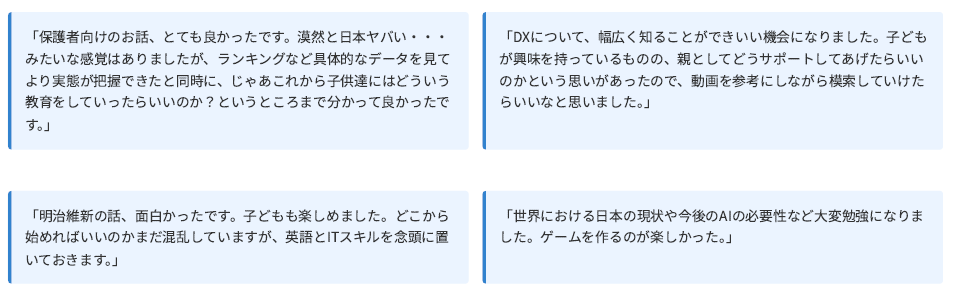 本取り組みは、次世代のデジタル人材育成と家庭におけるDXリテラシーの向上を目的として実施され、参加者・保護者の双方から高い評価を得る結果となりました。